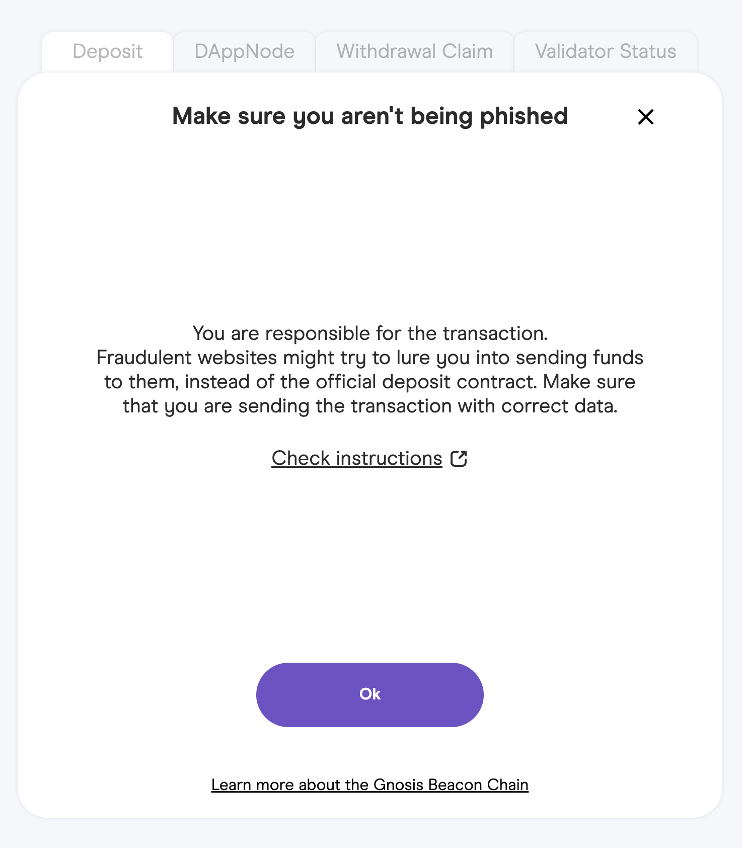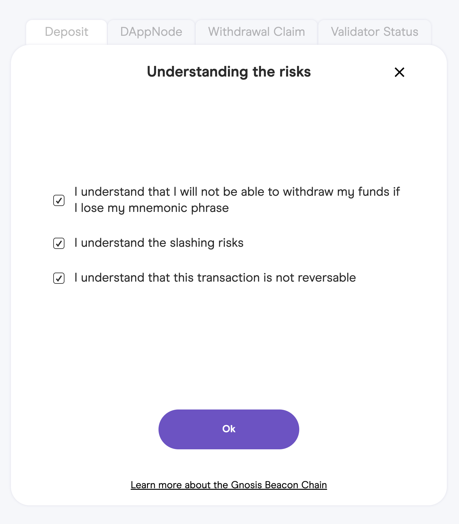 You are about to make the deposit on the official **Gnosis Beacon Chain Deposit** web site.  This is a serious commitment and cannot be reversed once you completed the deposit.&#x20;