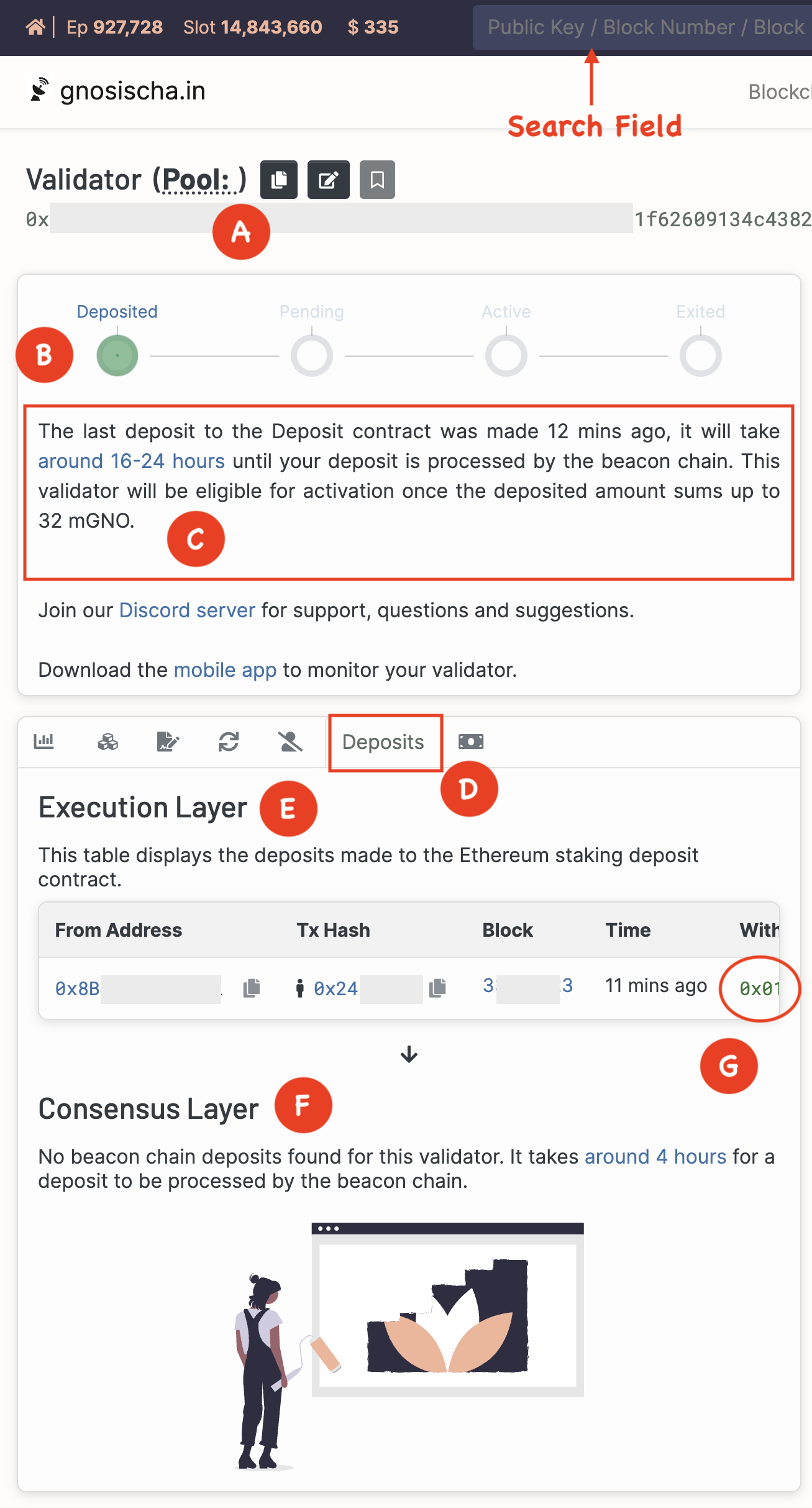 * **F. "Consensus Layer":** In this example, the deposit has not been recognized by the Beacon Chain.  Once recognized, this section will display the epoch, slot, and time when the deposit was recognized.