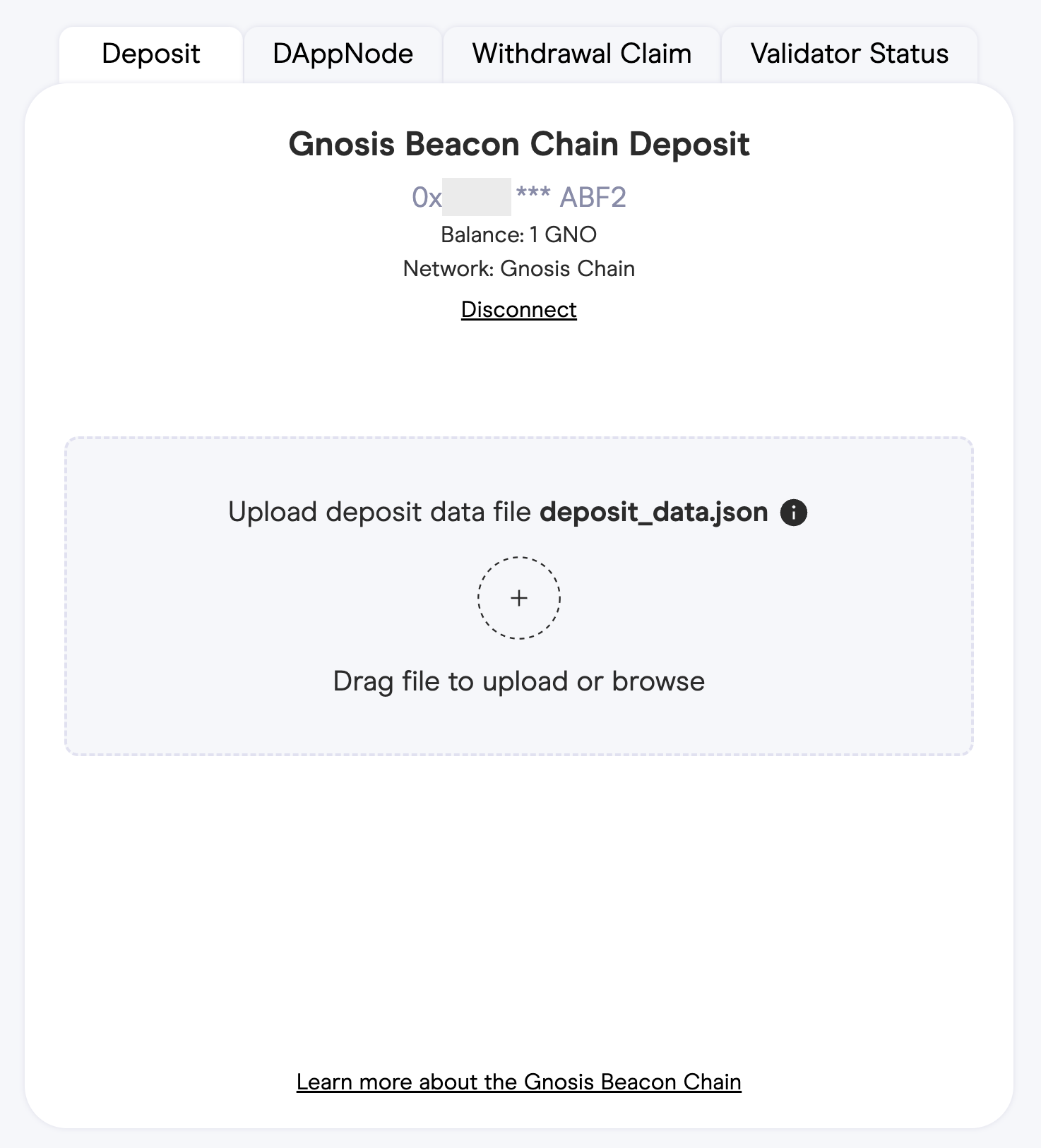 In the key generation step, you have created the **deposit data** file.  You have now uploaded the file to the Gnosis Beacon Chain Deposit site along with a 1 GNO deposit per validator.