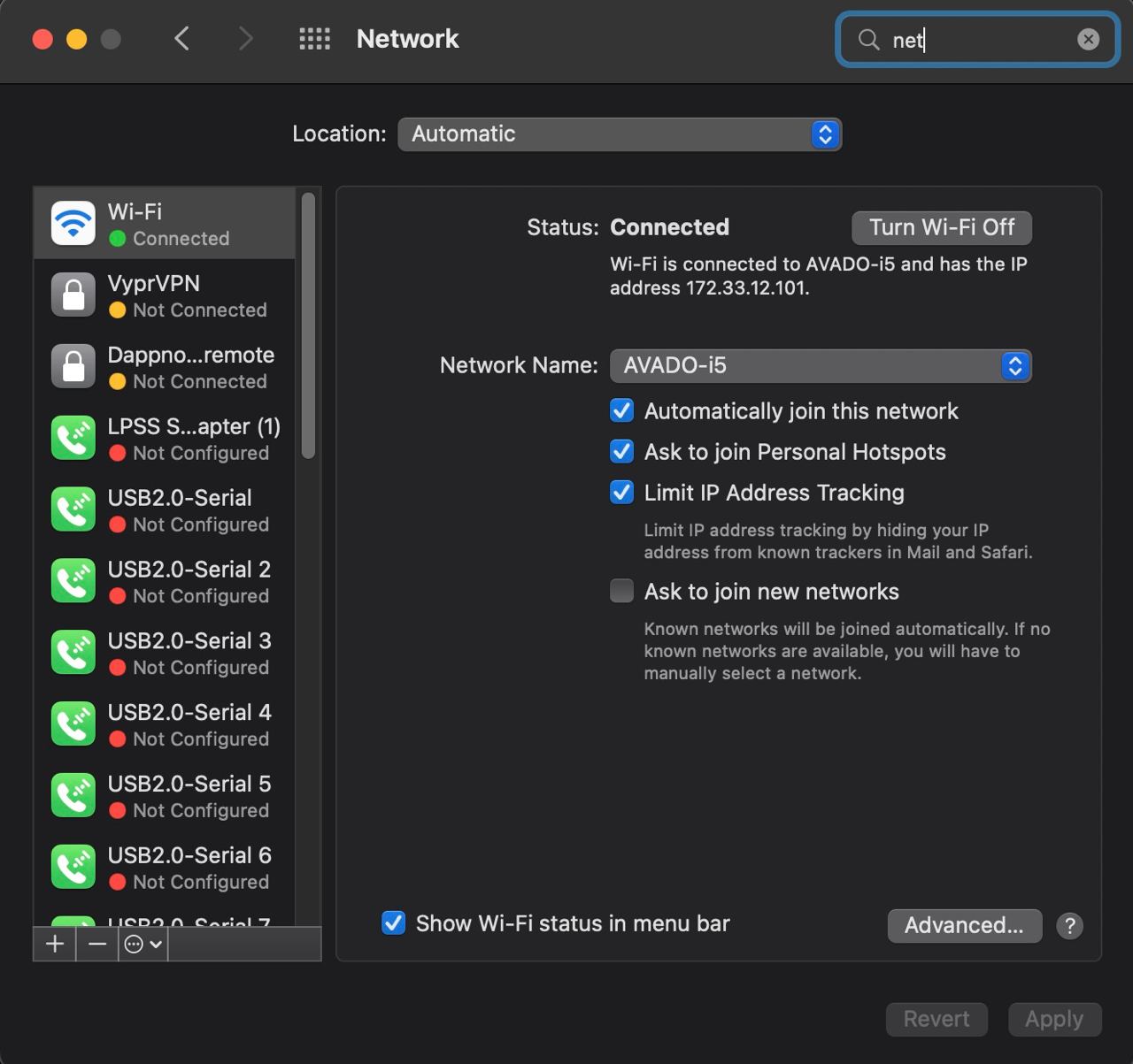The AVADO Wi-Fi connects to a local network with IP addresses that start with `172.33.12.xxx`.  You can verify if this is correct on your device.  The following screenshots are taken from the Mac; it should work similarly on Windows.