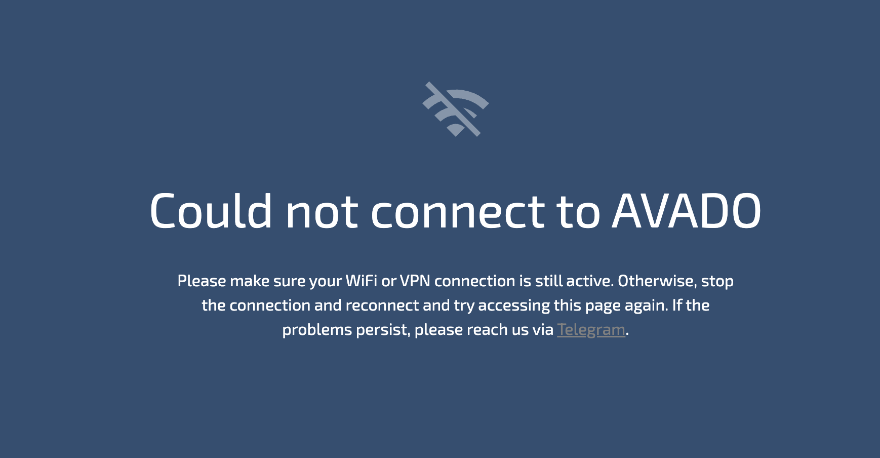 <figure><img src="https://2996176873-files.gitbook.io/~/files/v0/b/gitbook-x-prod.appspot.com/o/spaces%2F0YTdumceG05uJMtaEgaT%2Fuploads%2FeL9zFIB8fsgA5ffvRCEe%2Fhelp-connect-could-not-connect-to-avado.png?alt=media&#x26;token=af509e75-3569-4f61-8ceb-8bd2643a8fa8" alt="" width="563"><figcaption></figcaption></figure>