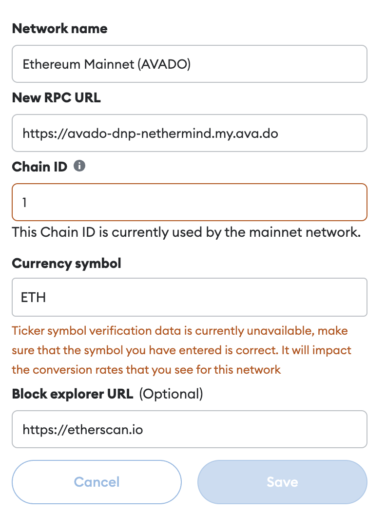<table><thead><tr><th width="224">Item</th><th>Value</th></tr></thead><tbody><tr><td><strong>Network Name</strong></td><td>Give this a name for easy reference, for example, "AVADO"</td></tr><tr><td><strong>RPC URL</strong></td><td><ul><li><p>For <strong>Geth</strong> (choose one):</p><ul><li>http://ethchain-geth.my.ava.do:8545</li><li><strong>https:</strong>//ethchain-geth.my.ava.do</li></ul></li><li><p>For <strong>Nethermind</strong> (choose one):</p><ul><li>http://avado-dnp-nethermind.my.ava.do:8545</li><li><strong>https</strong>://avado-dnp-nethermind.my.ava.do</li></ul></li></ul></td></tr><tr><td><strong>Chain ID</strong></td><td><code>1</code>  - The default Chain ID for Ethereum Mainnet is 1.  Metamask will warn that "This Chain ID is currently being used by the mainnet network".  This is OK.</td></tr><tr><td><strong>Currency symbol</strong></td><td><code>ETH</code></td></tr><tr><td><strong>Block explorer URL</strong></td><td>https://etherscan.io</td></tr></tbody></table>